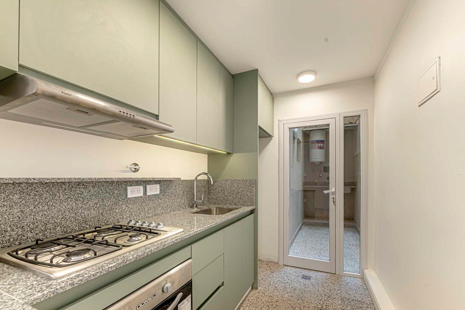 Cocina integrada moderna y lavadero independiente.