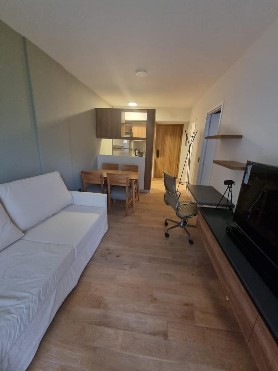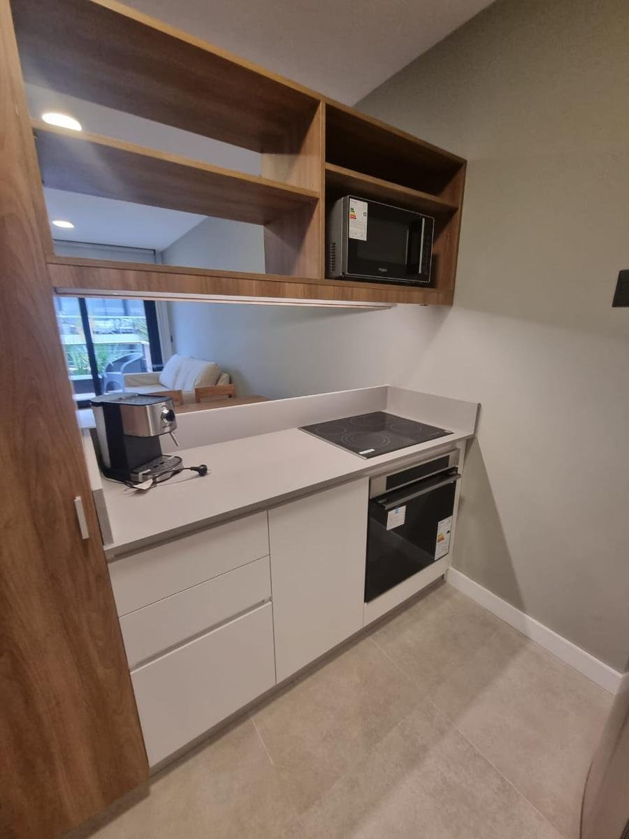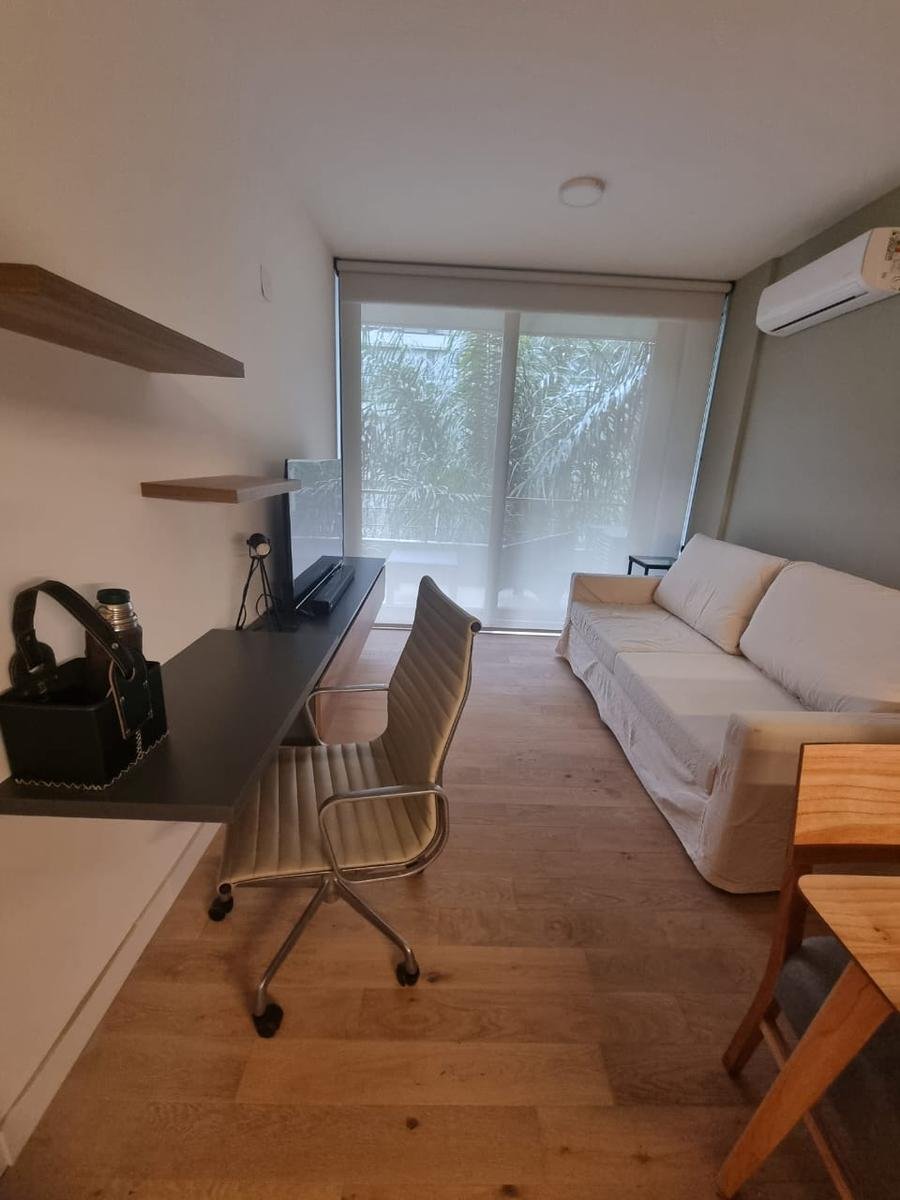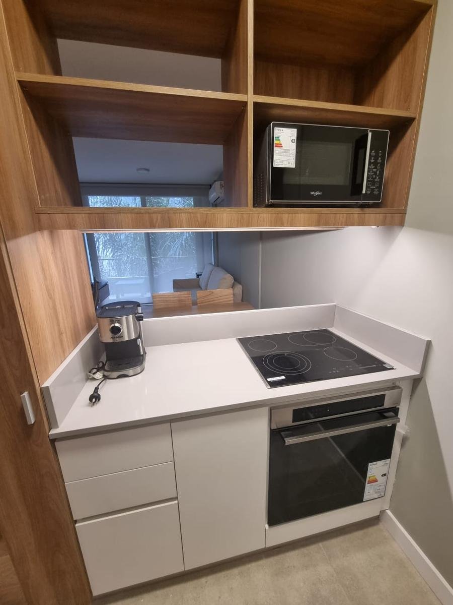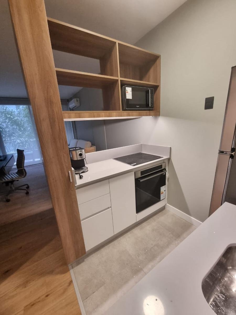 Cocina integrada al living, muy cómoda con bastante espacio de guardado. Microondas, cafetera, tostadora, vajilla, heladera. El living tiene un amplio sillón, mesa con 4 sillas, modular de guardado con televisión, escritorio con silla, lamparas, cortinas, con muy buen gusto, diseño y calidad. Salida al balcón.