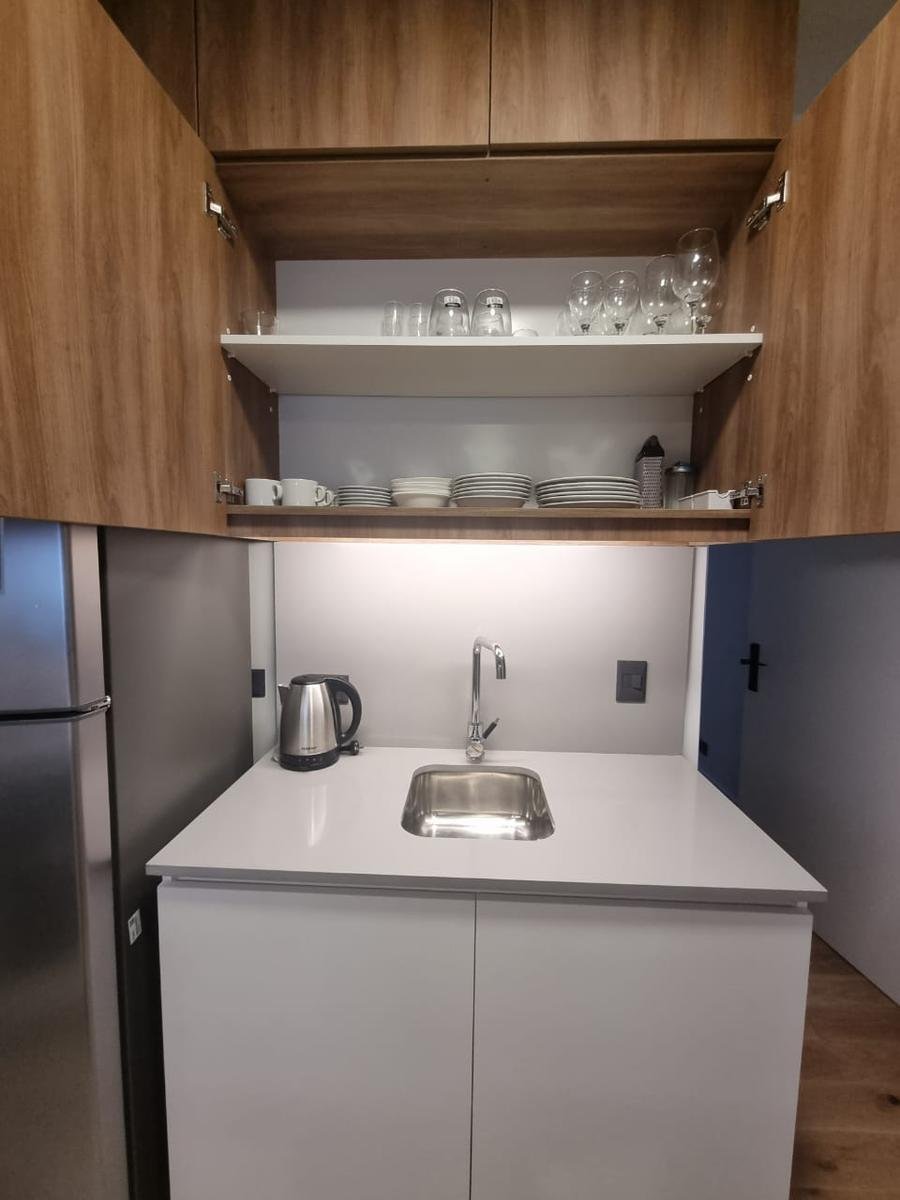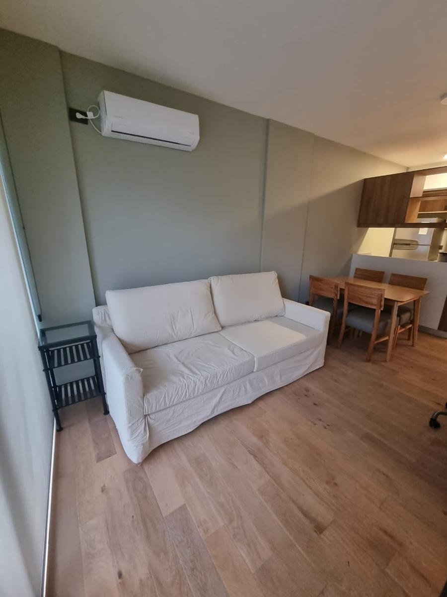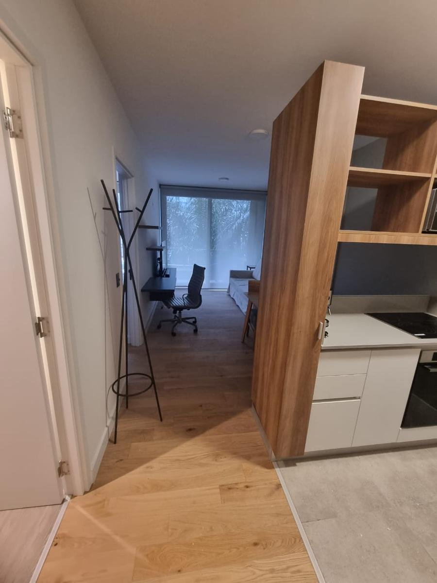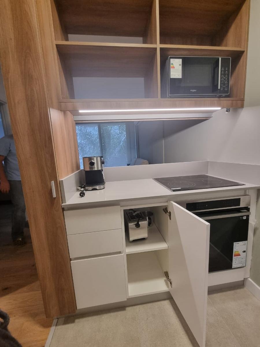 Cocina integrada al living, muy cómoda con bastante espacio de guardado. Microondas, cafetera, tostadora, vajilla, heladera. El living tiene un amplio sillón, mesa con 4 sillas, modular de guardado con televisión, escritorio con silla, lamparas, cortinas, con muy buen gusto, diseño y calidad. Salida al balcón.