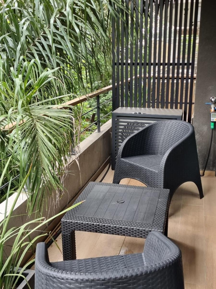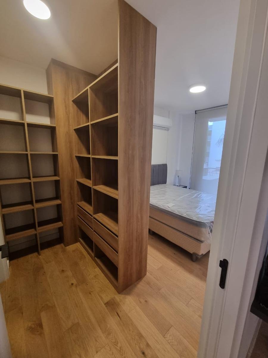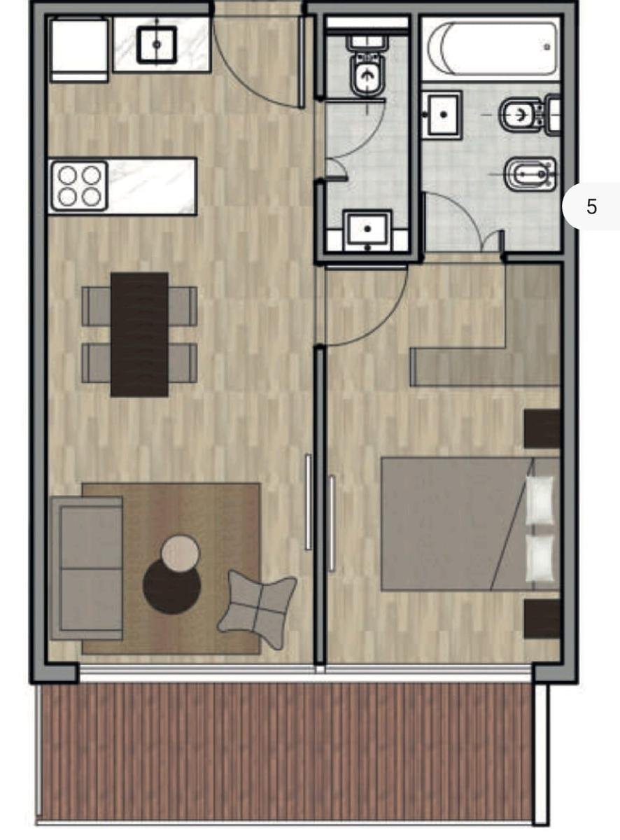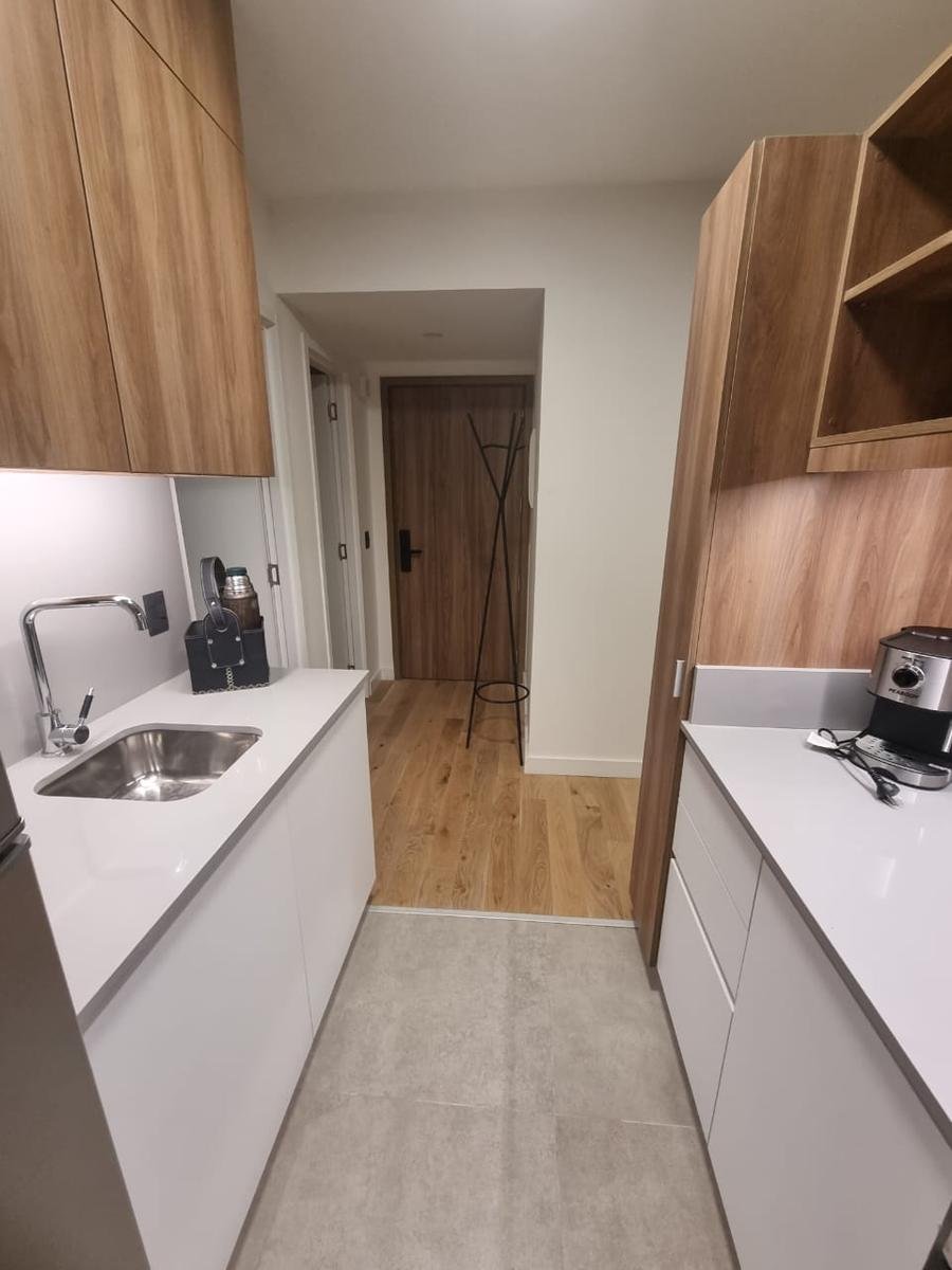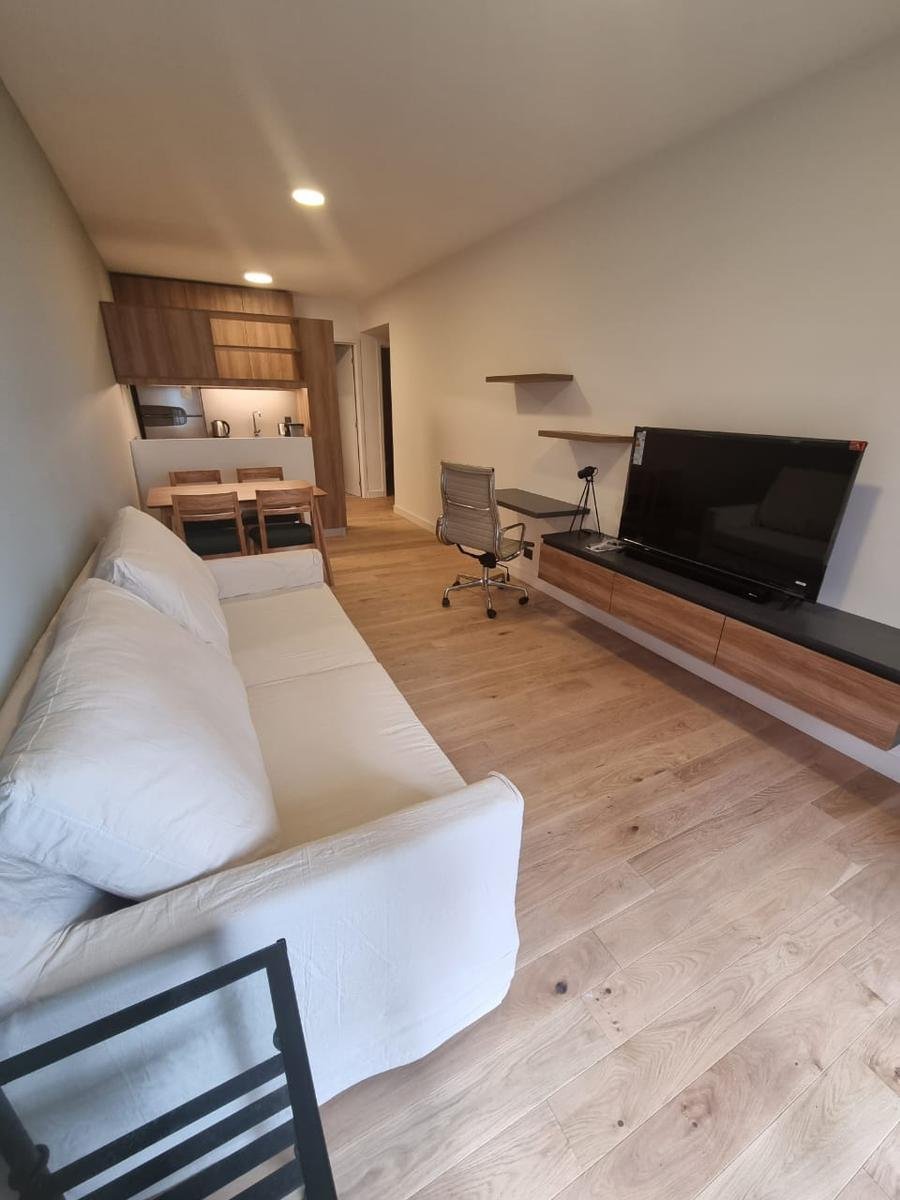 Cocina integrada al living, muy cómoda con bastante espacio de guardado. Microondas, cafetera, tostadora, vajilla, heladera. El living tiene un amplio sillón, mesa con 4 sillas, modular de guardado con televisión, escritorio con silla, lamparas, cortinas, con muy buen gusto, diseño y calidad. Salida al balcón.
