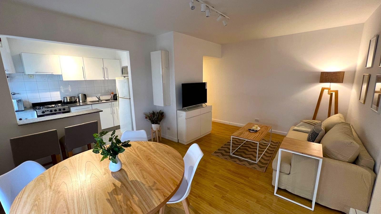 Cuenta con toilette de recepción, un living comedor con moderno amoblamiento, cocina independiente con barra y salida a un balcón muy cómodo y amplio,