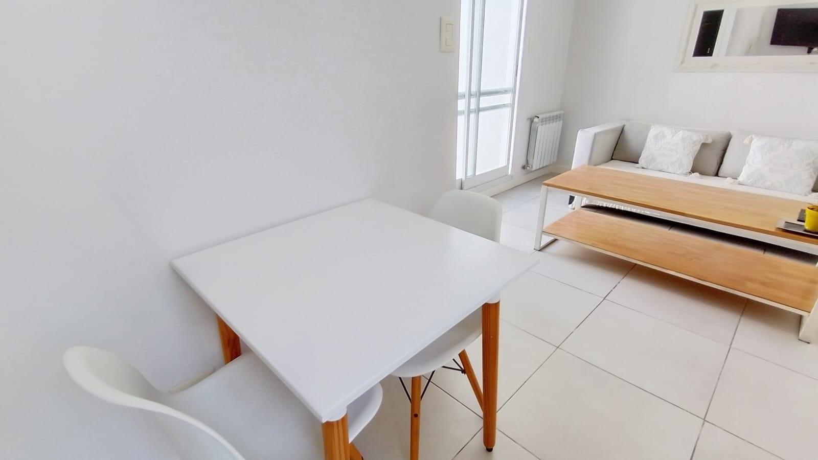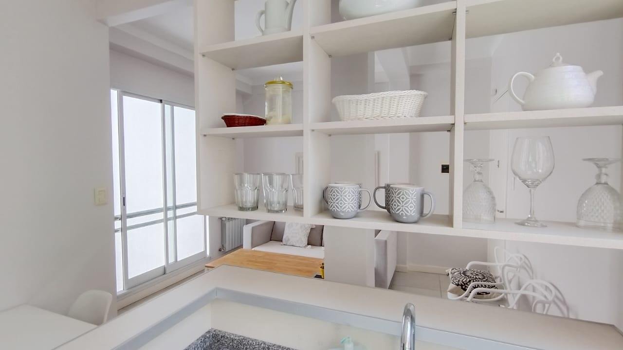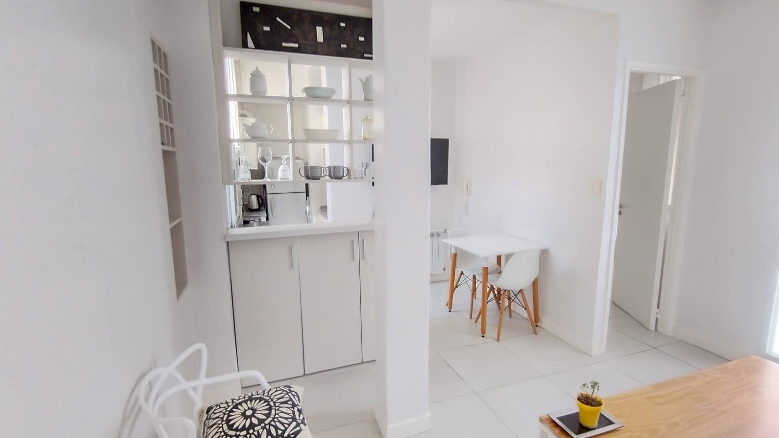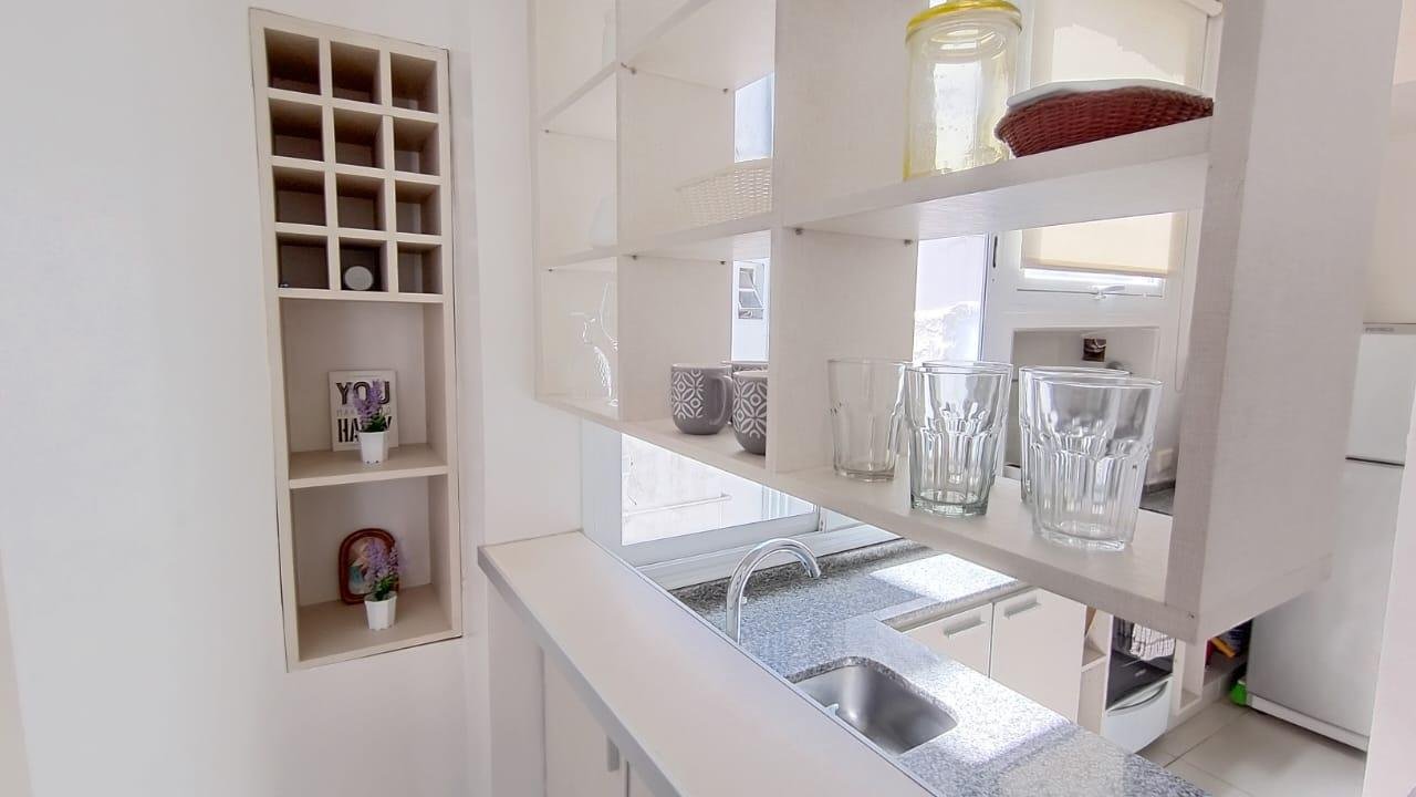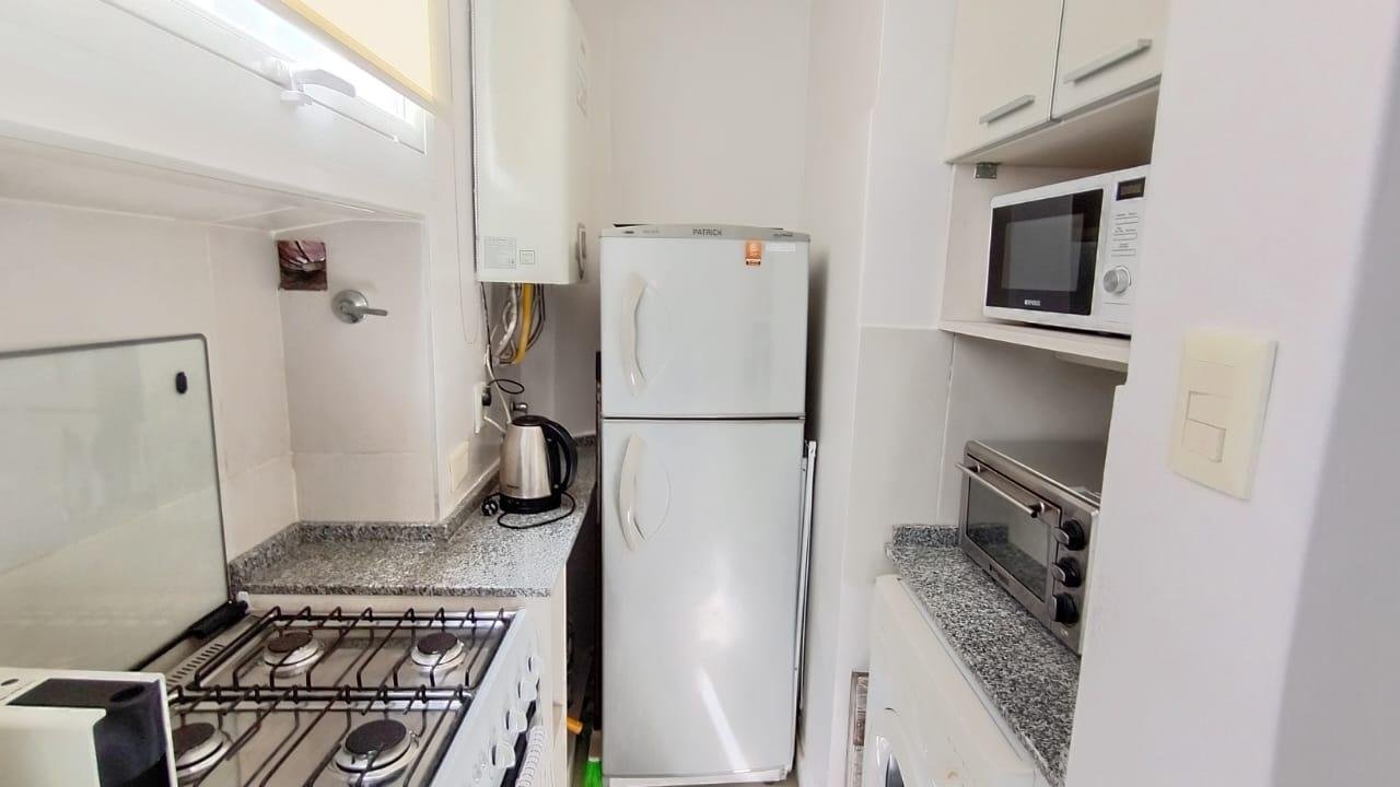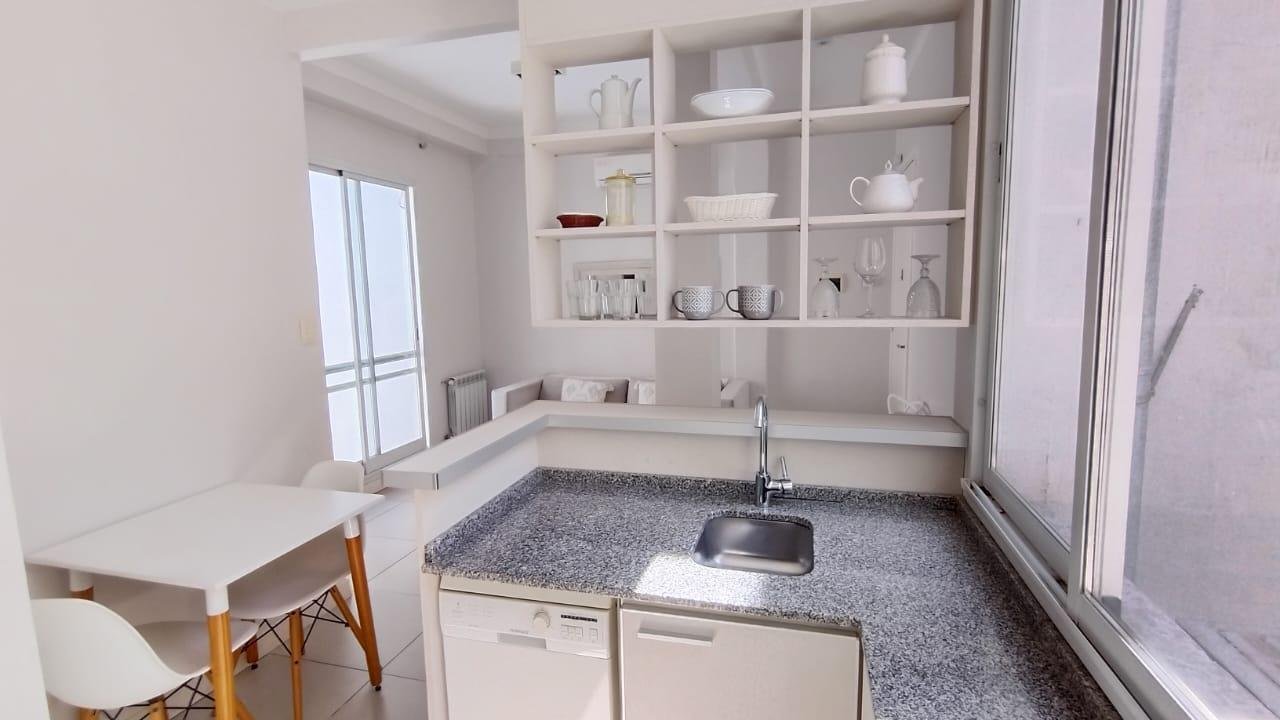 Ingresando al departamento nos encontramos con un living comedor con tv y cocina integrada, amplia y cómoda. Con mucho espacio de guardado con muebles bajo mesada, espacio para vinos, copas y electrodomesticos. Mesada de granito y cocina con horno a gas. Equipada con heladera, lavarropas, lavavajillas, micoondas, pava eléctrica y tostádora. Una mesita para poder sentarse para la cena o desayunar. Sillón, mesa ratona, sillas y vajilla completa.
