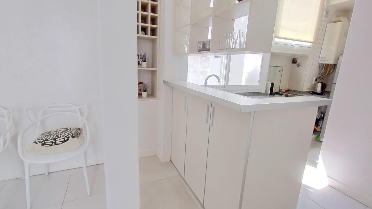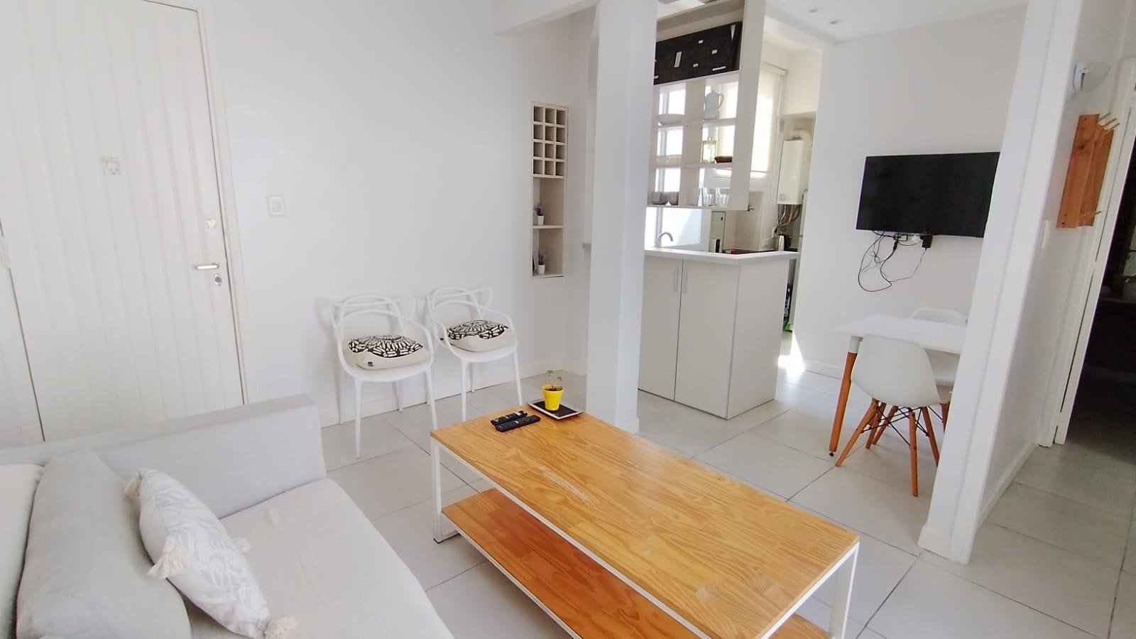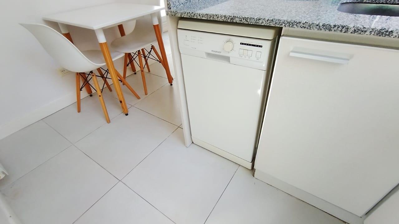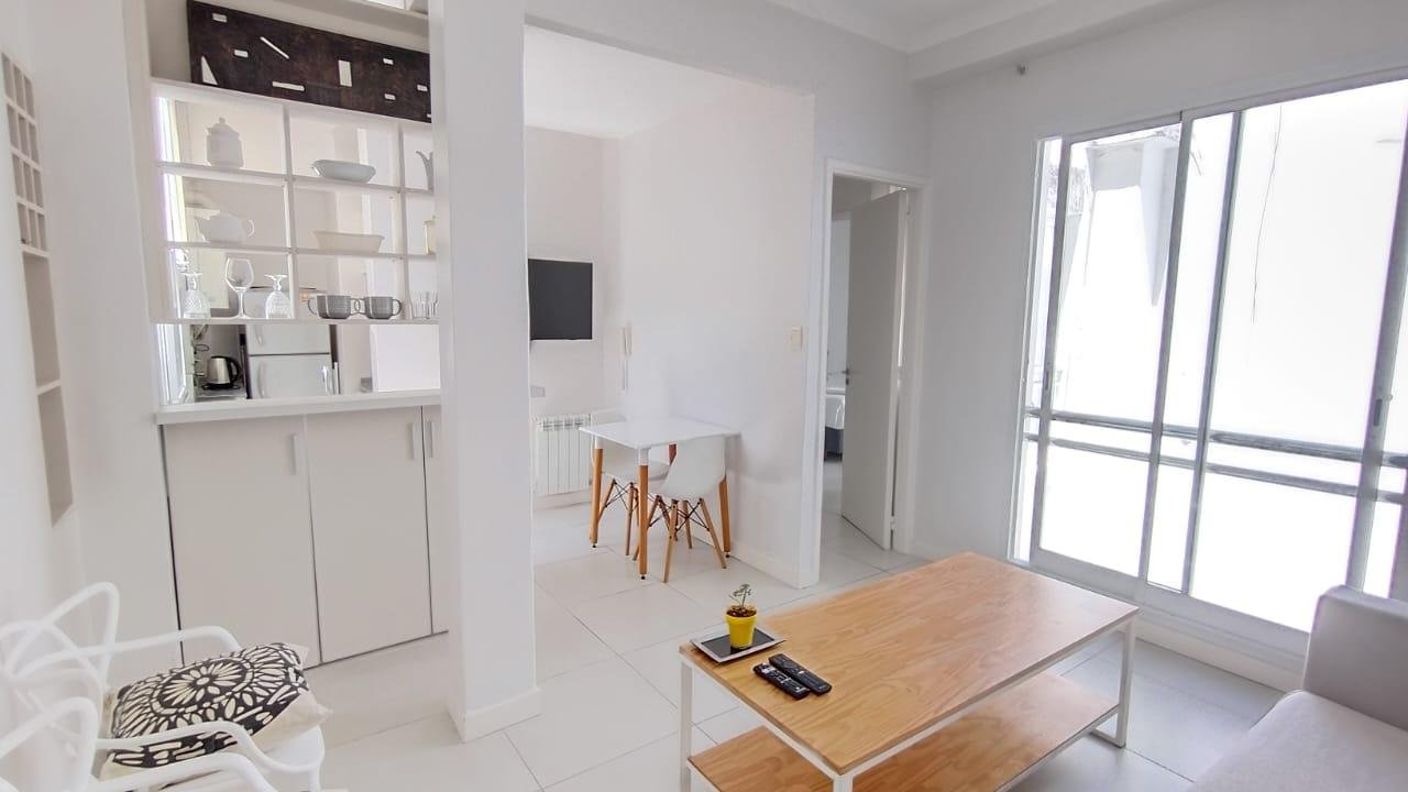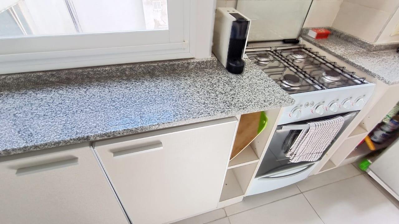 Ingresando al departamento nos encontramos con un living comedor con tv y cocina integrada, amplia y cómoda. Con mucho espacio de guardado con muebles bajo mesada, espacio para vinos, copas y electrodomesticos. Mesada de granito y cocina con horno a gas. Equipada con heladera, lavarropas, lavavajillas, micoondas, pava eléctrica y tostádora. Una mesita para poder sentarse para la cena o desayunar. Sillón, mesa ratona, sillas y vajilla completa.