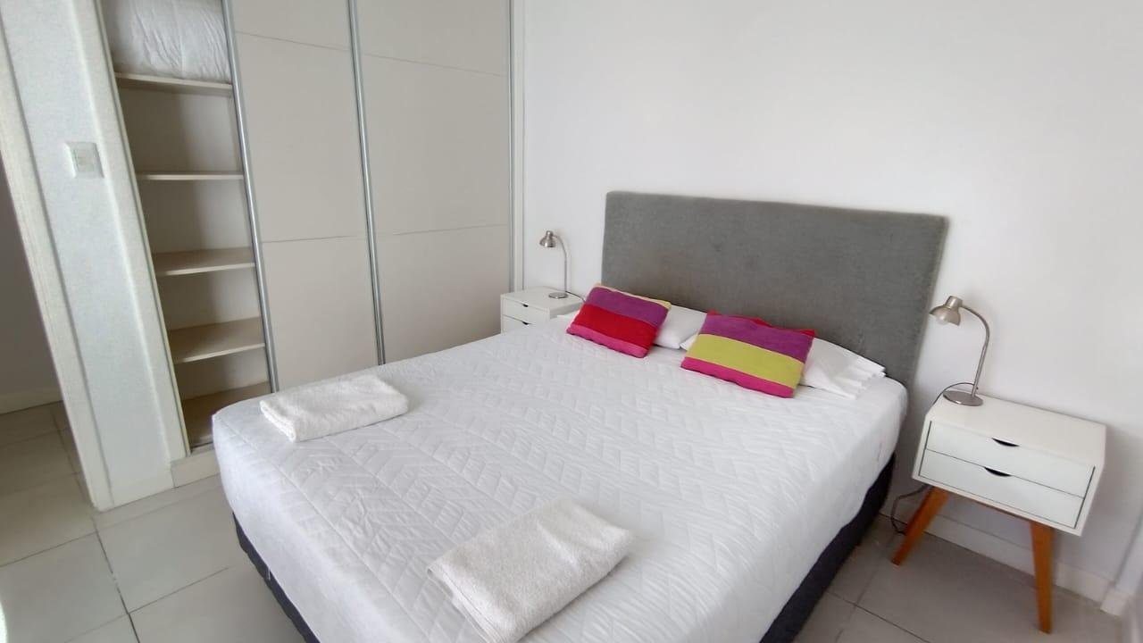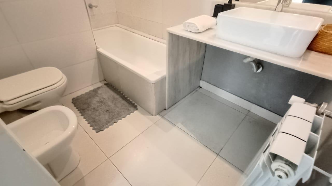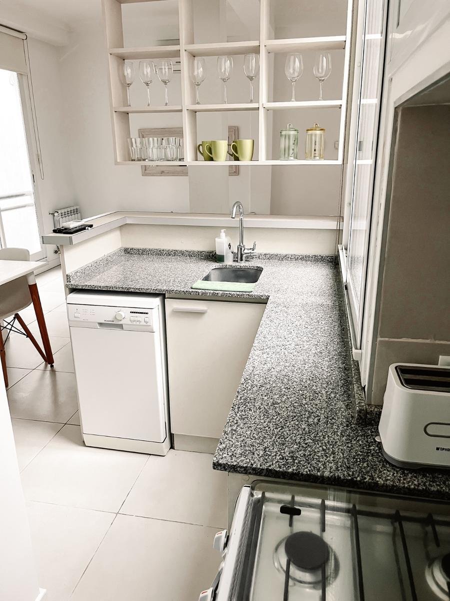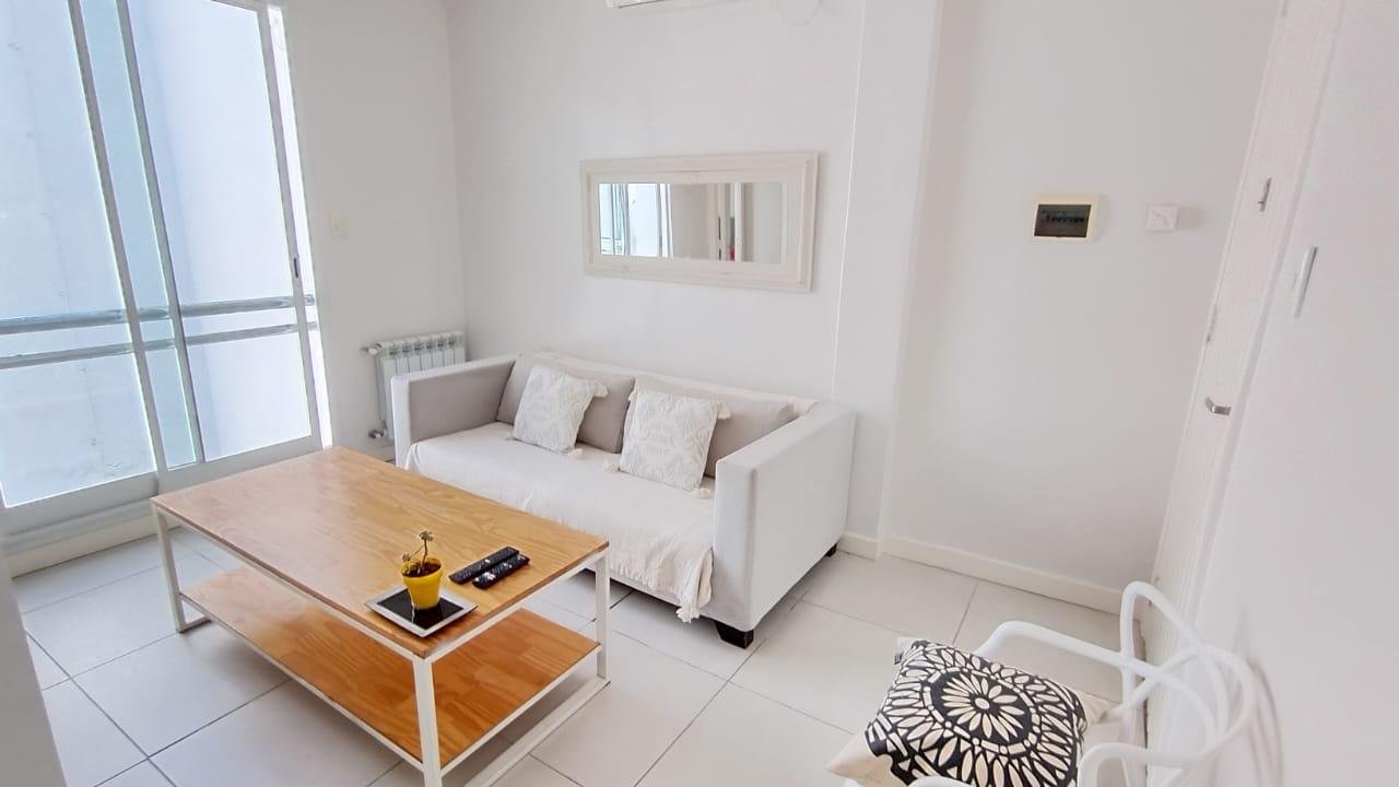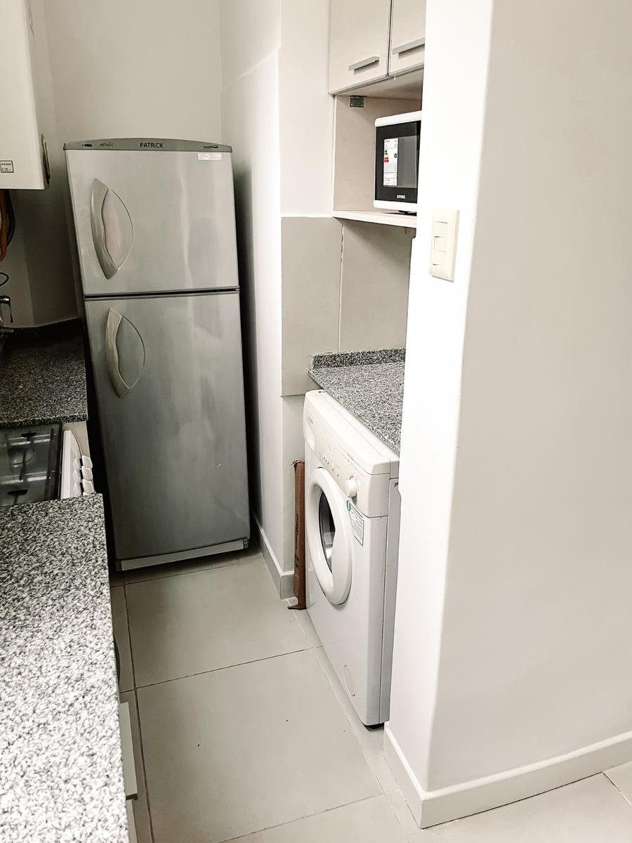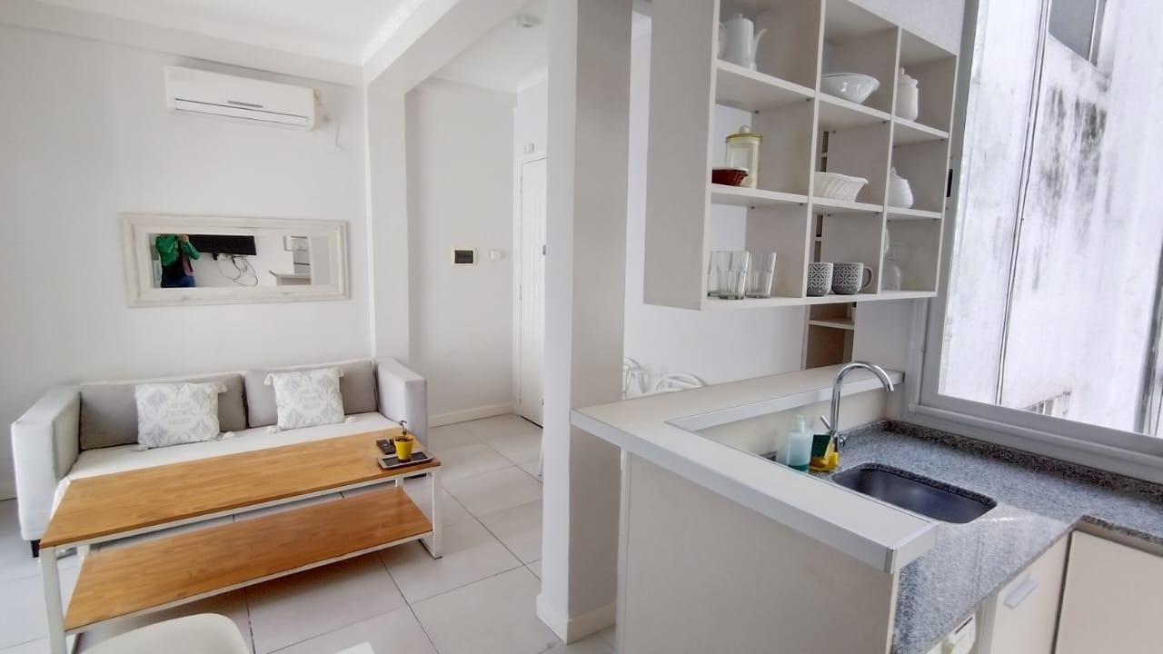 Ingresando al departamento nos encontramos con un living comedor con tv y cocina integrada, amplia y cómoda. Con mucho espacio de guardado con muebles bajo mesada, espacio para vinos, copas y electrodomesticos. Mesada de granito y cocina con horno a gas. Equipada con heladera, lavarropas, lavavajillas, micoondas, pava eléctrica y tostádora. Una mesita para poder sentarse para la cena o desayunar. Sillón, mesa ratona, sillas y vajilla completa.