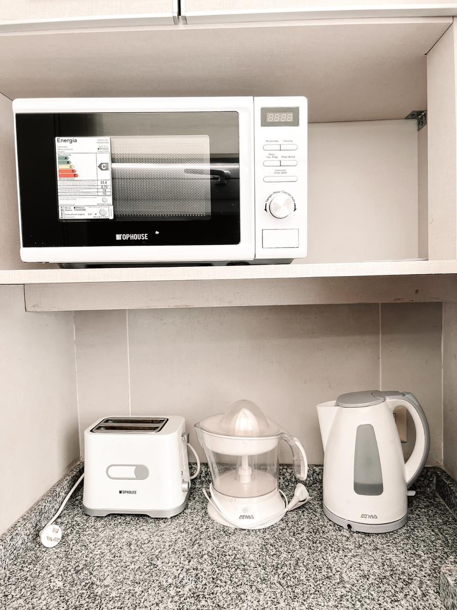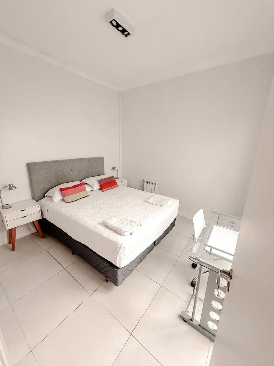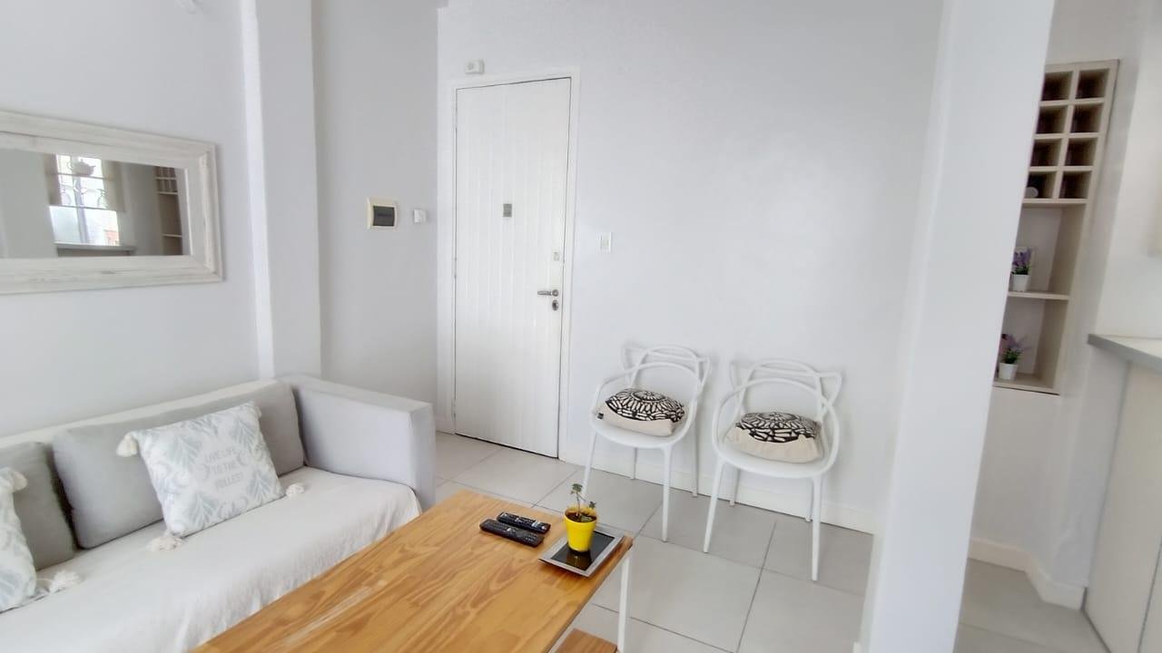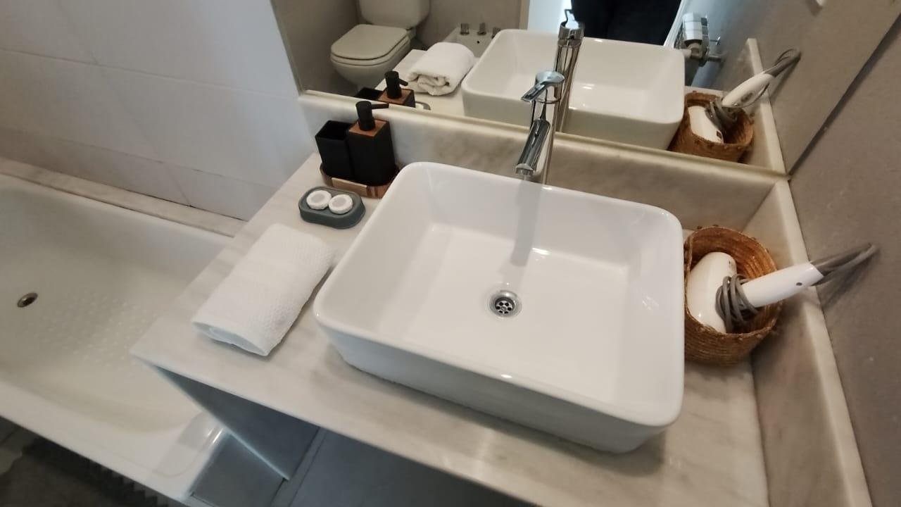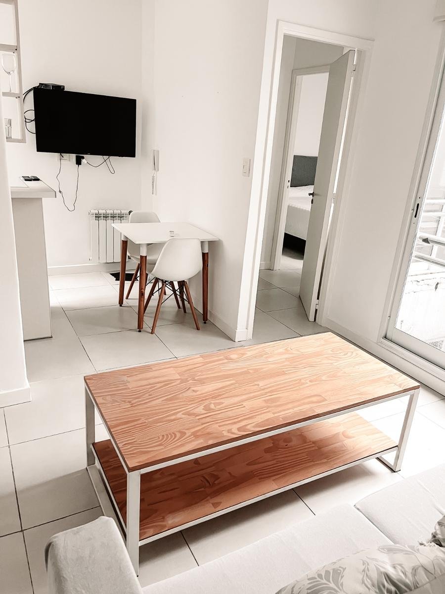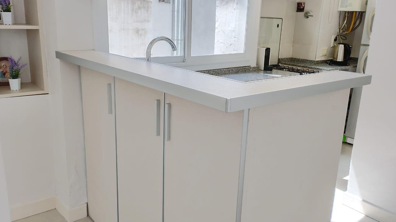 Ingresando al departamento nos encontramos con un living comedor con tv y cocina integrada, amplia y cómoda. Con mucho espacio de guardado con muebles bajo mesada, espacio para vinos, copas y electrodomesticos. Mesada de granito y cocina con horno a gas. Equipada con heladera, lavarropas, lavavajillas, micoondas, pava eléctrica y tostádora. Una mesita para poder sentarse para la cena o desayunar. Sillón, mesa ratona, sillas y vajilla completa.