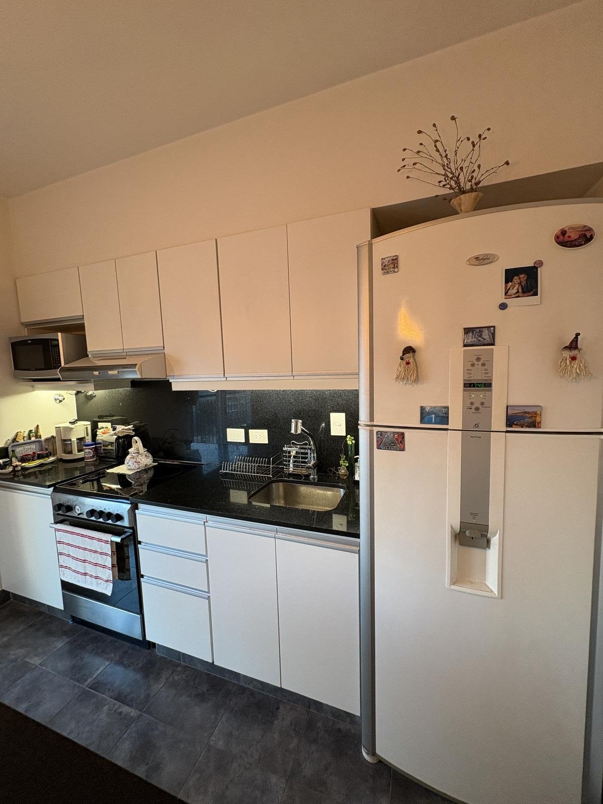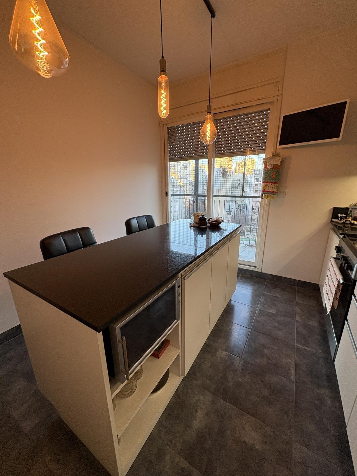 Cocina refaccionada (pisos de cerámica, mesadas de mármol negro., cocina eléctrica vitrocerámica) con mesa desayunadora y salida al balcón (opcional gas)