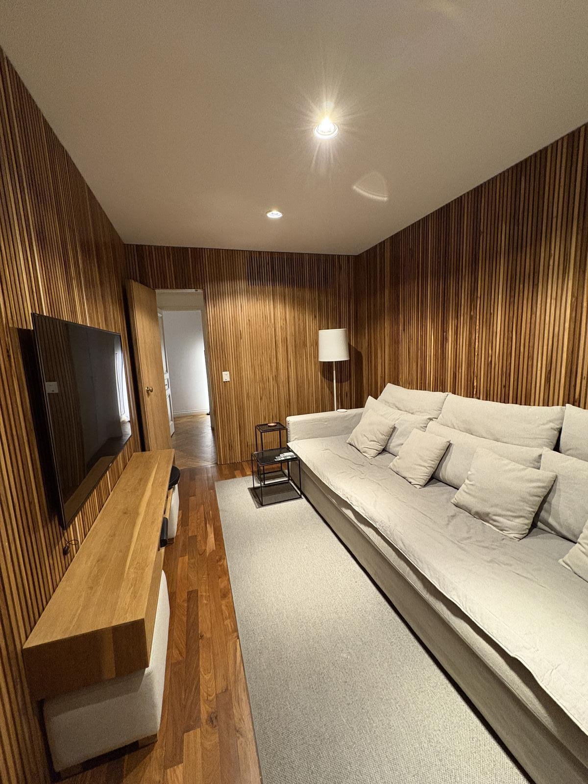 Se accede a un Hall de Recepción a través de una Doble Puerta de entrada de madera, que abre al amplio Living y Comedor apaisado al frente con salida a balcón francés. Techos altos, pisos de madera de roble de Eslavonia con diseño artesanal, detalles de buen gusto y confort. Bar con mesada de mármol.