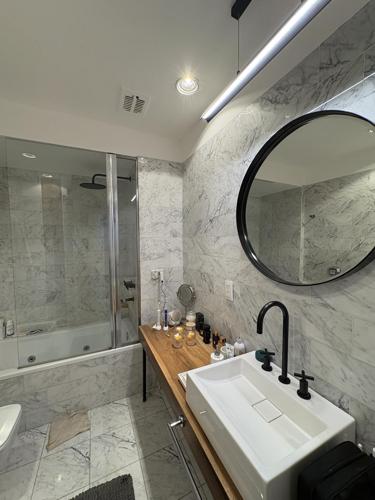 Dormitorio principal en suite de gran tamaño (6 m x 4m) más vestidor con mucho espacio de guardado. Baño en Suite revestido en mármol de Carrara.