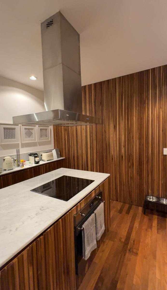 Alucinante cocina con isla, doble mesada, íntegramente revestida en madera. diseño de última generación, profusión de alacenas y muebles bajo mesada.