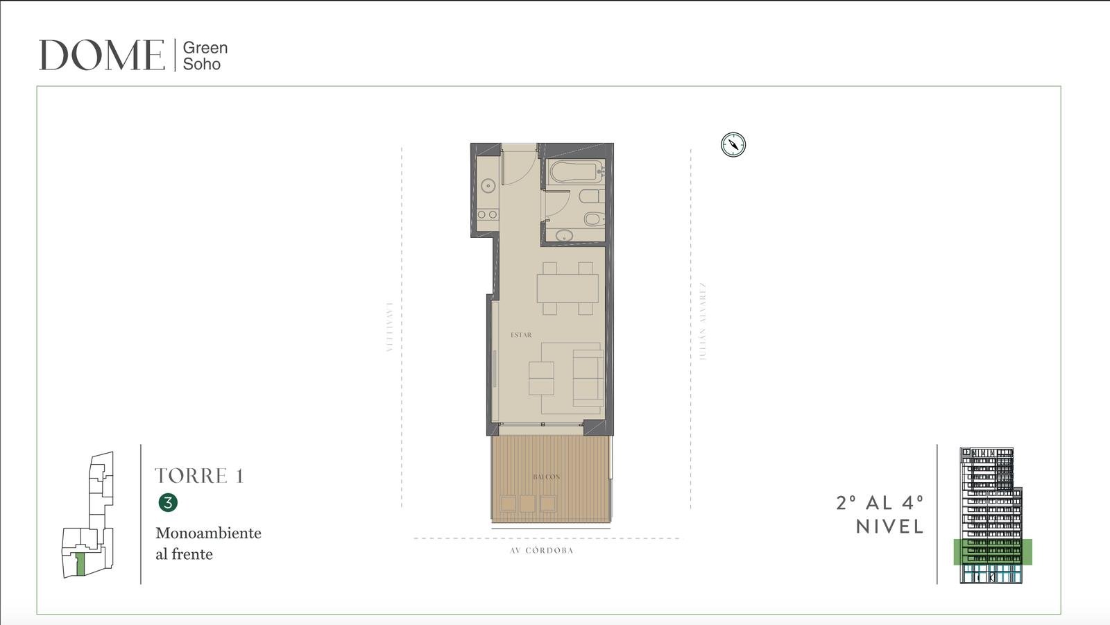 Descubrí esta unidad monoambiente al frente en el exclusivo edificio DOME Green Soho, ubicado en Av. Córdoba 4340, en la intersección de Palermo Soho y Villa Crespo.