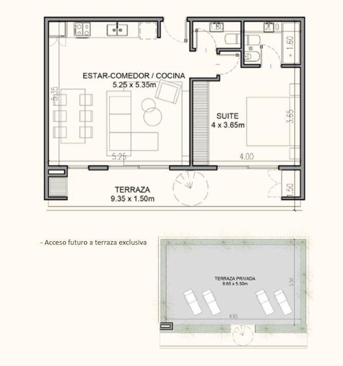 El departamento cuenta con un espacioso living comedor con cocina integrada con espacio para lavarropas, un toilette y una suite con vestidor y baño completo.