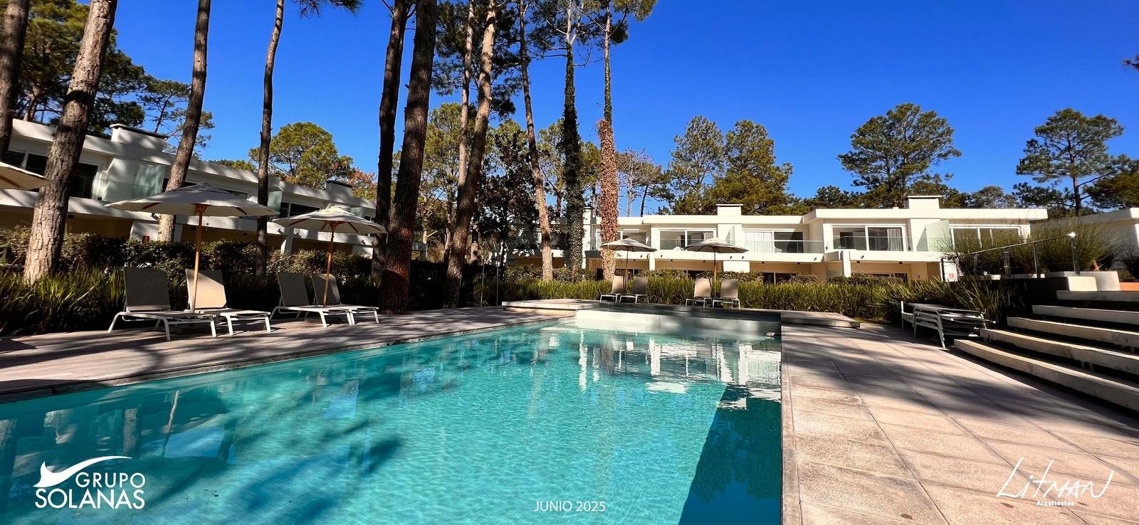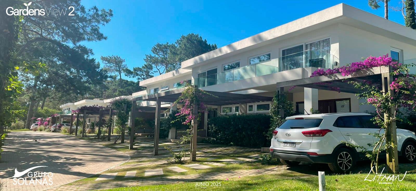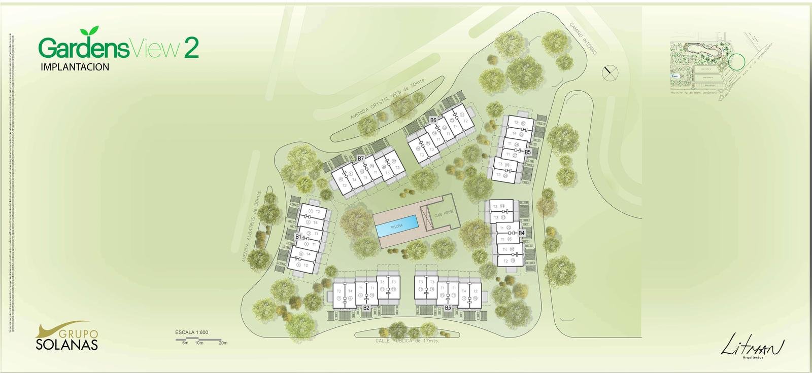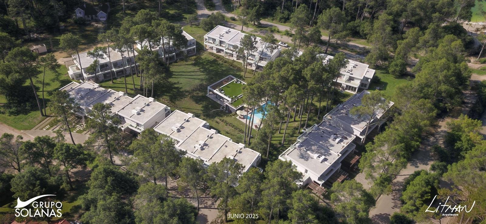 En un entrono arbolado dentro del Complejo Solanas y a metros de la Crystal, se proyecto un complejo de 42 town – houses en un Estilo Rústico – Moderno con un club-house central, piscina y solarium y cancha de tenis