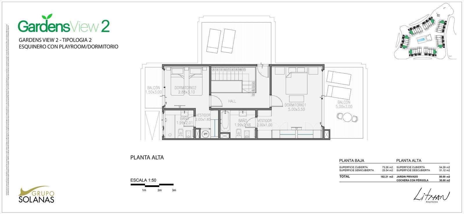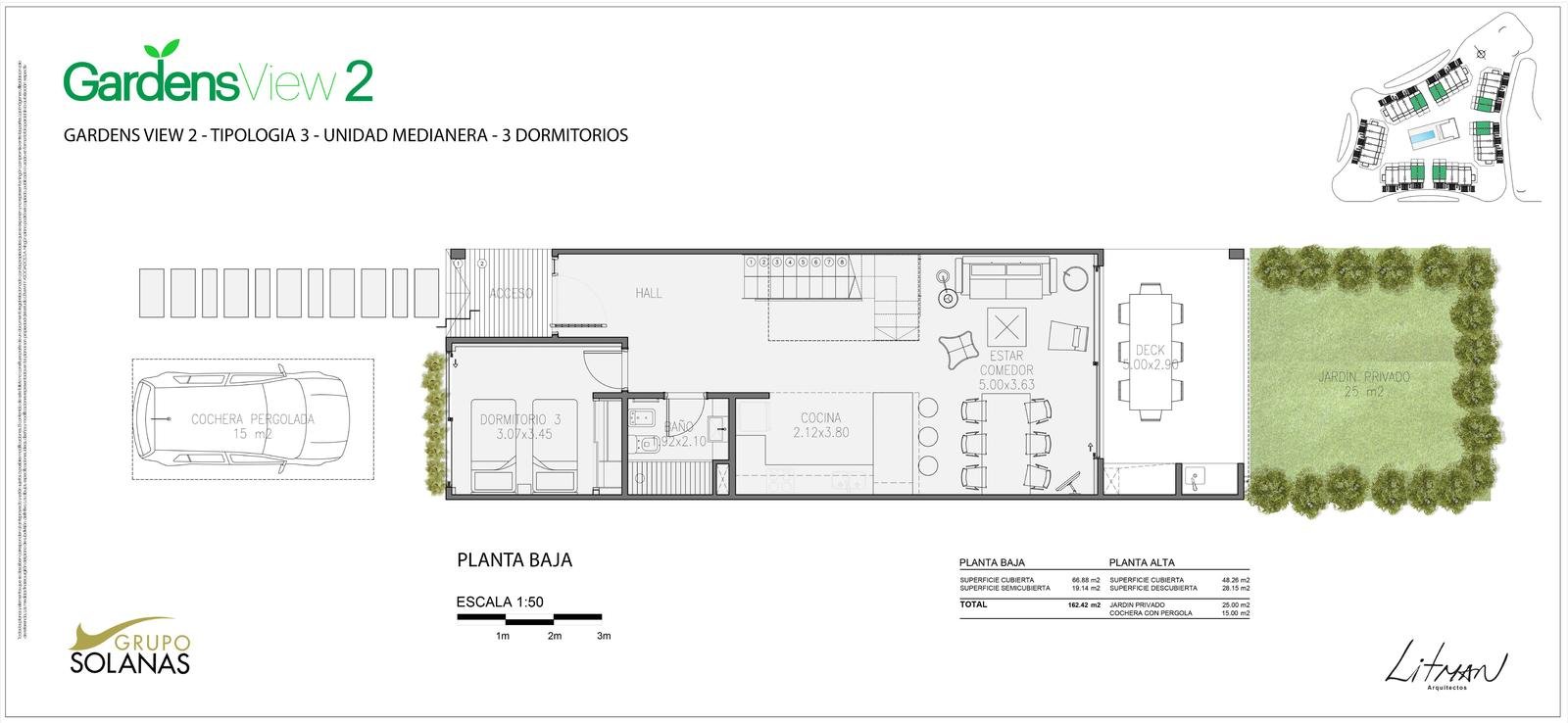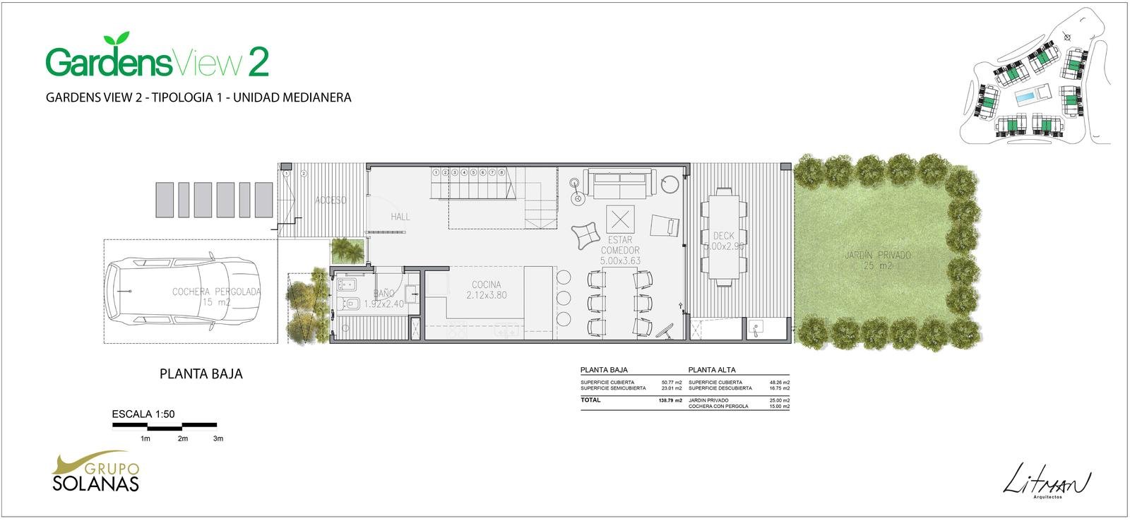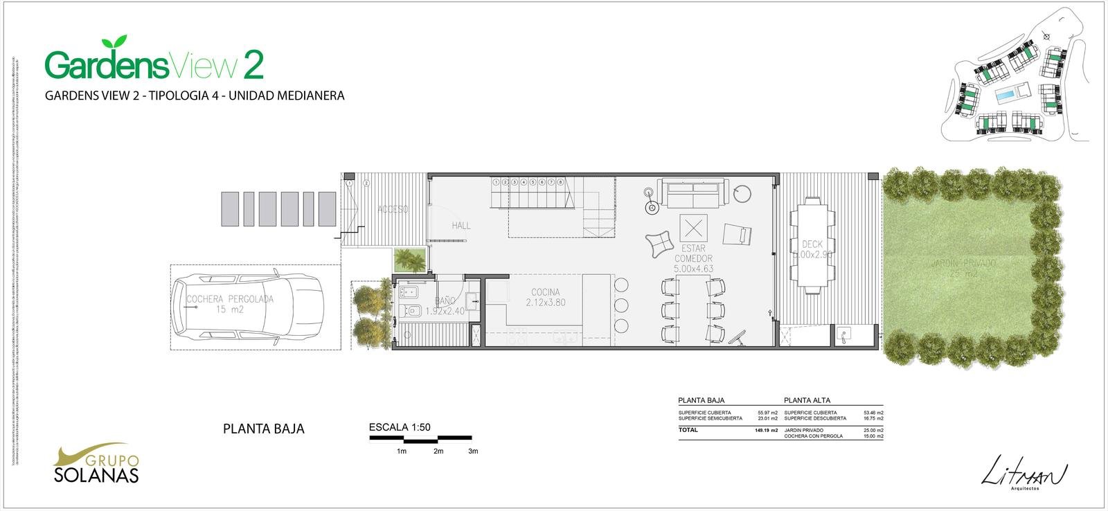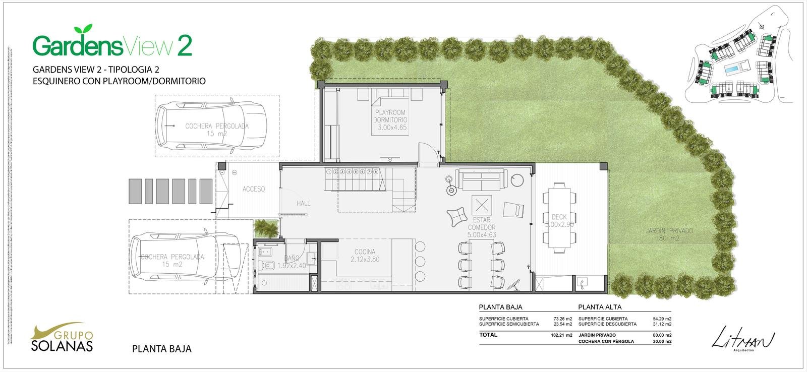 En un entrono arbolado dentro del Complejo Solanas y a metros de la Crystal, se proyecto un complejo de 42 town – houses en un Estilo Rústico – Moderno con un club-house central, piscina y solarium y cancha de tenis