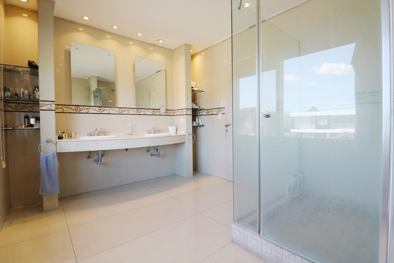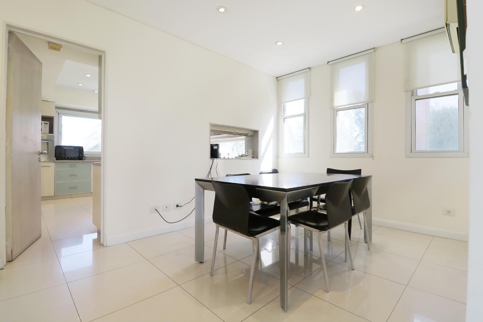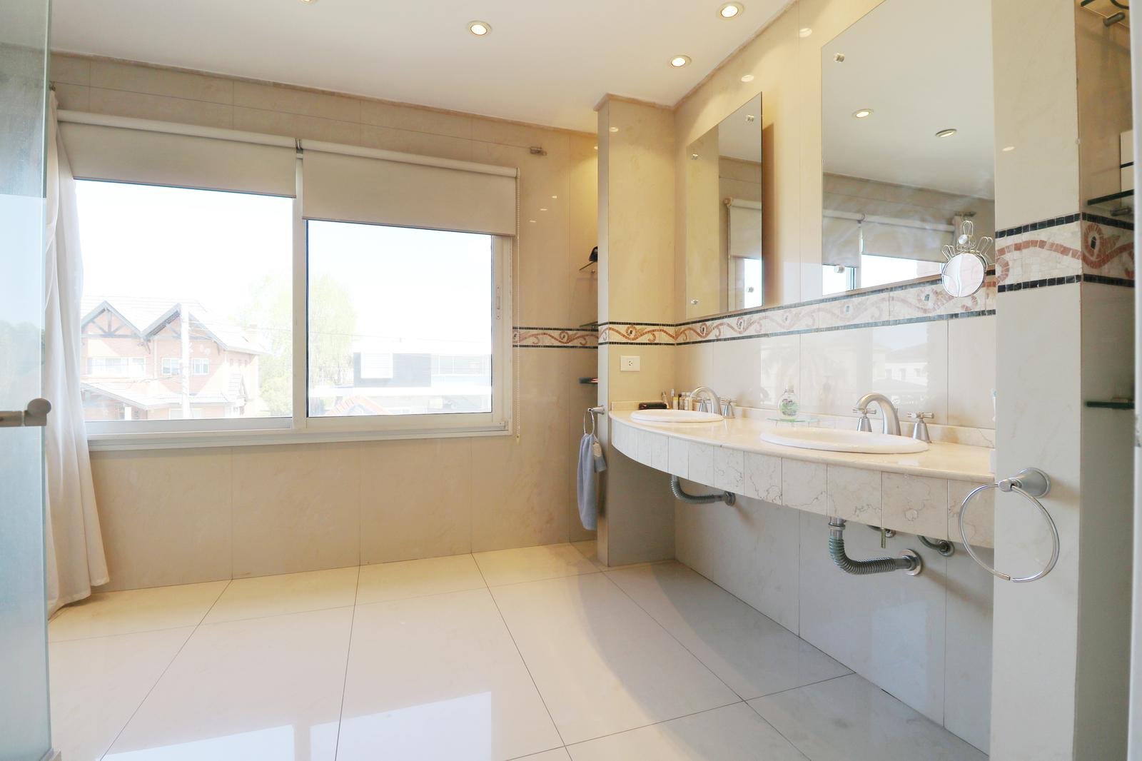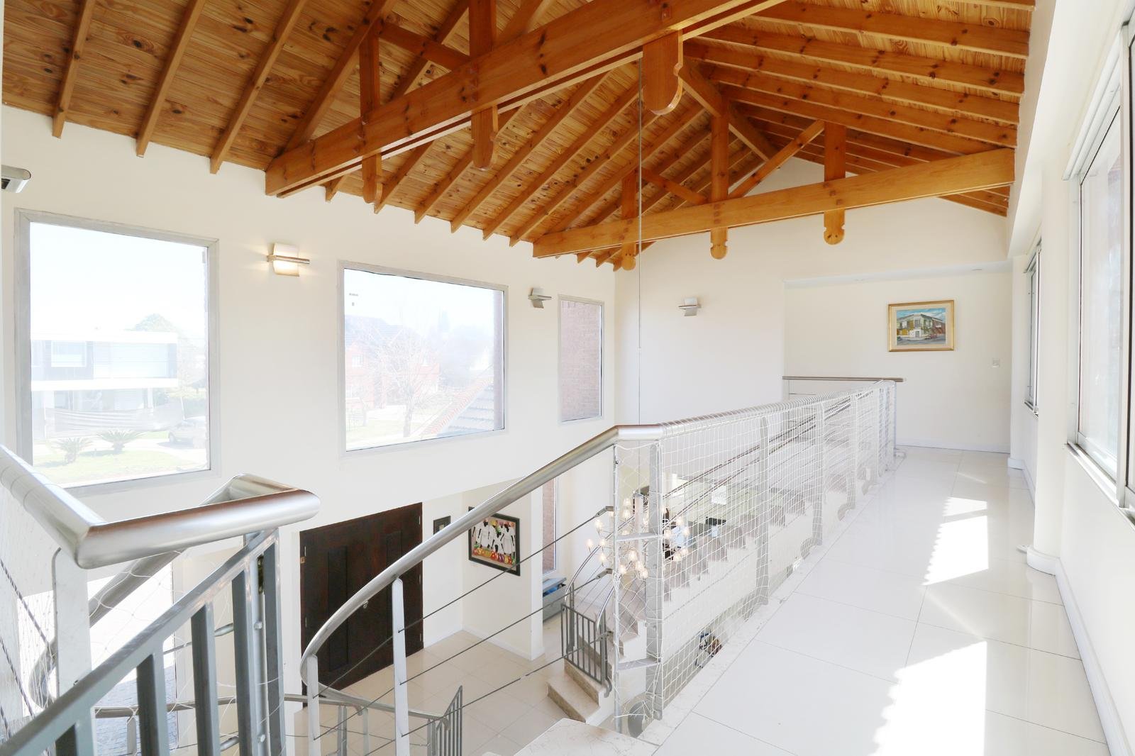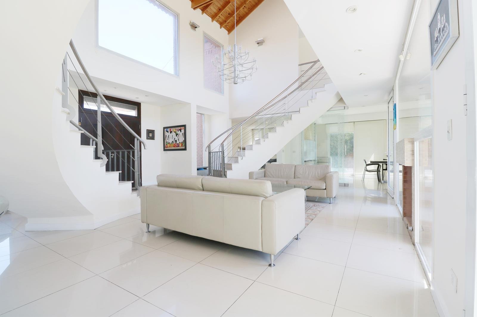 En la planta baja, te recibirán una sala de estar de gran amplitud con dos elegantes escaleras que conducen a los laterales de la casa, donde se encuentran los dormitorios. La cocina americana independiente con gran iluminación, y un comedor diario. Además, un amplio quincho cerrado con una parrilla te permitirá disfrutar de asados y reuniones con amigos y familiares en cualquier época del año. También encontrarás un family room con increibles vistas al jardin, un toilette para invitados y una dependencia con su propio toilette. El lavadero, con acceso lateral, añade una conveniencia extra. La cochera con espacio para dos autos y una galería destechada completan las comodidades de la planta baja.