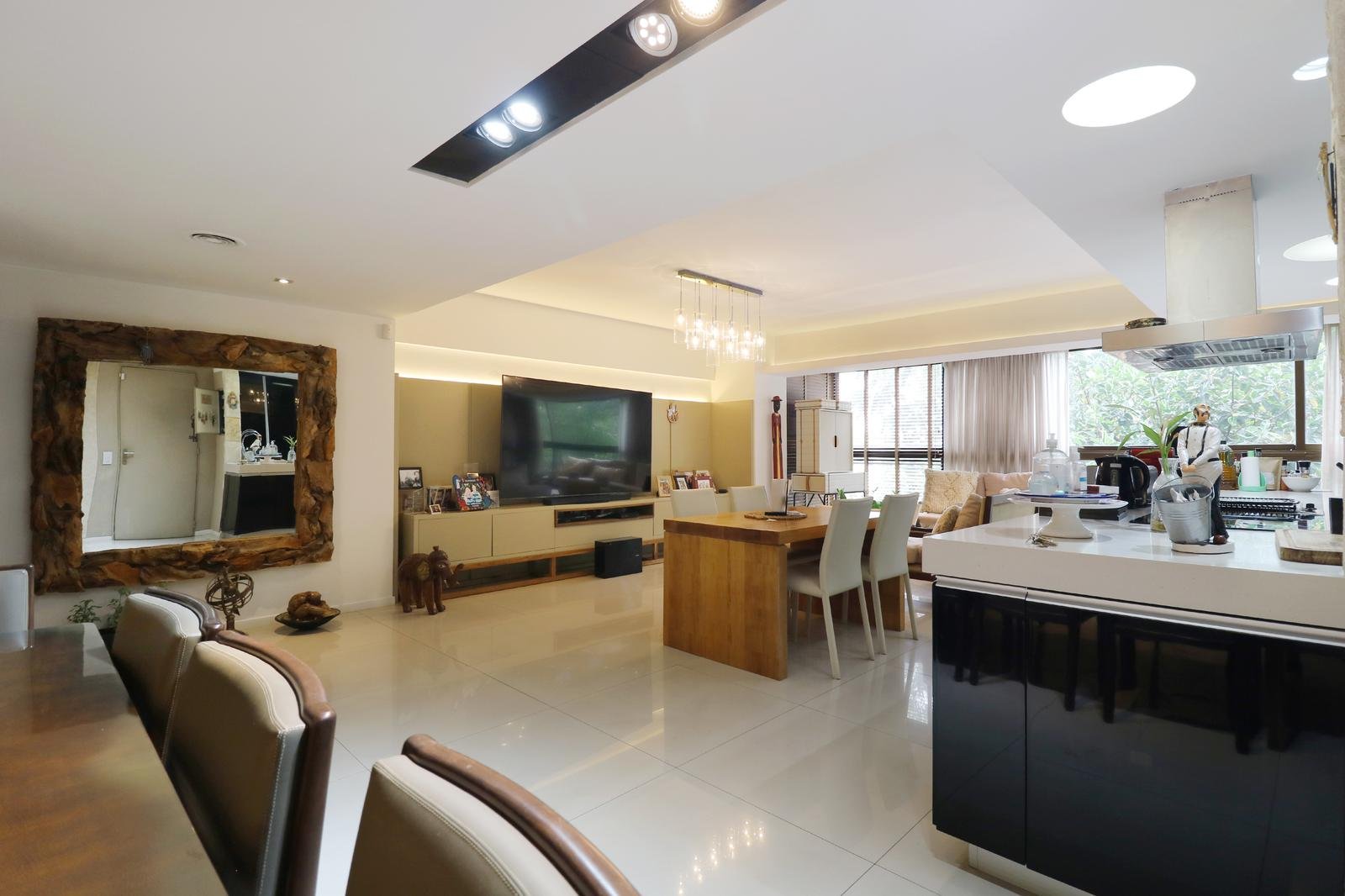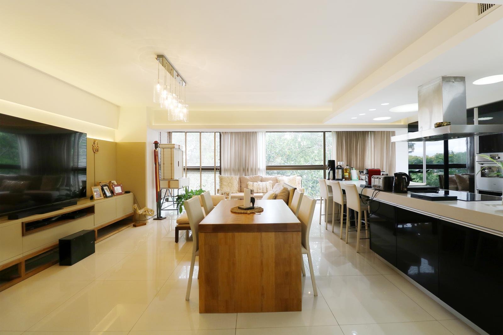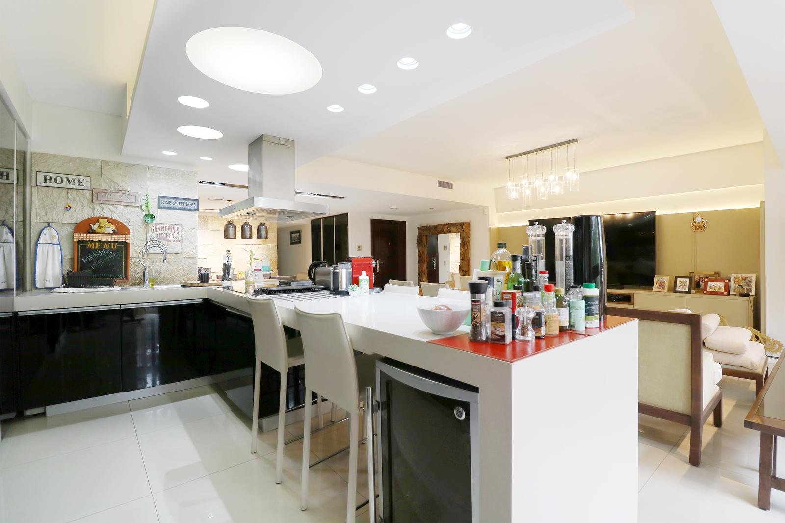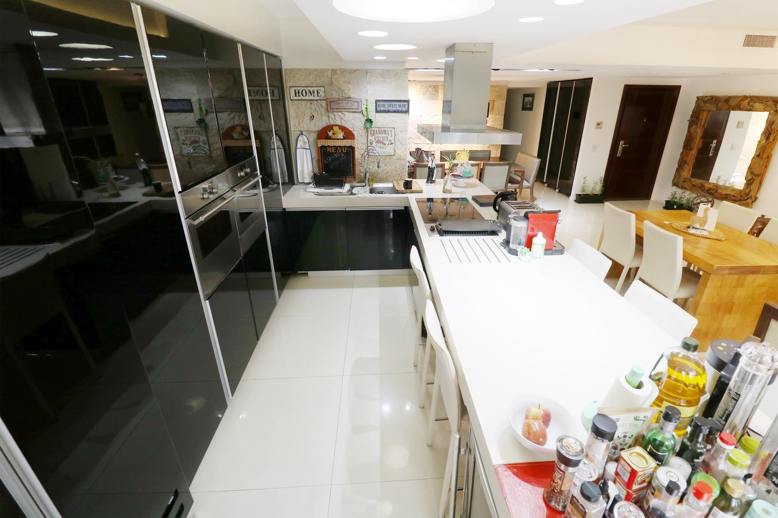 Tiene la cocina integrada,con cocina electrica,las heladeras son panelables.Tiene una barra desayunadora.