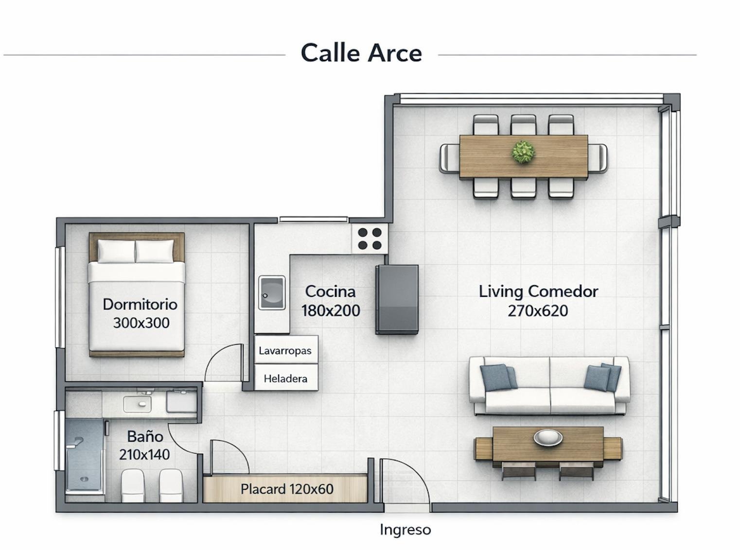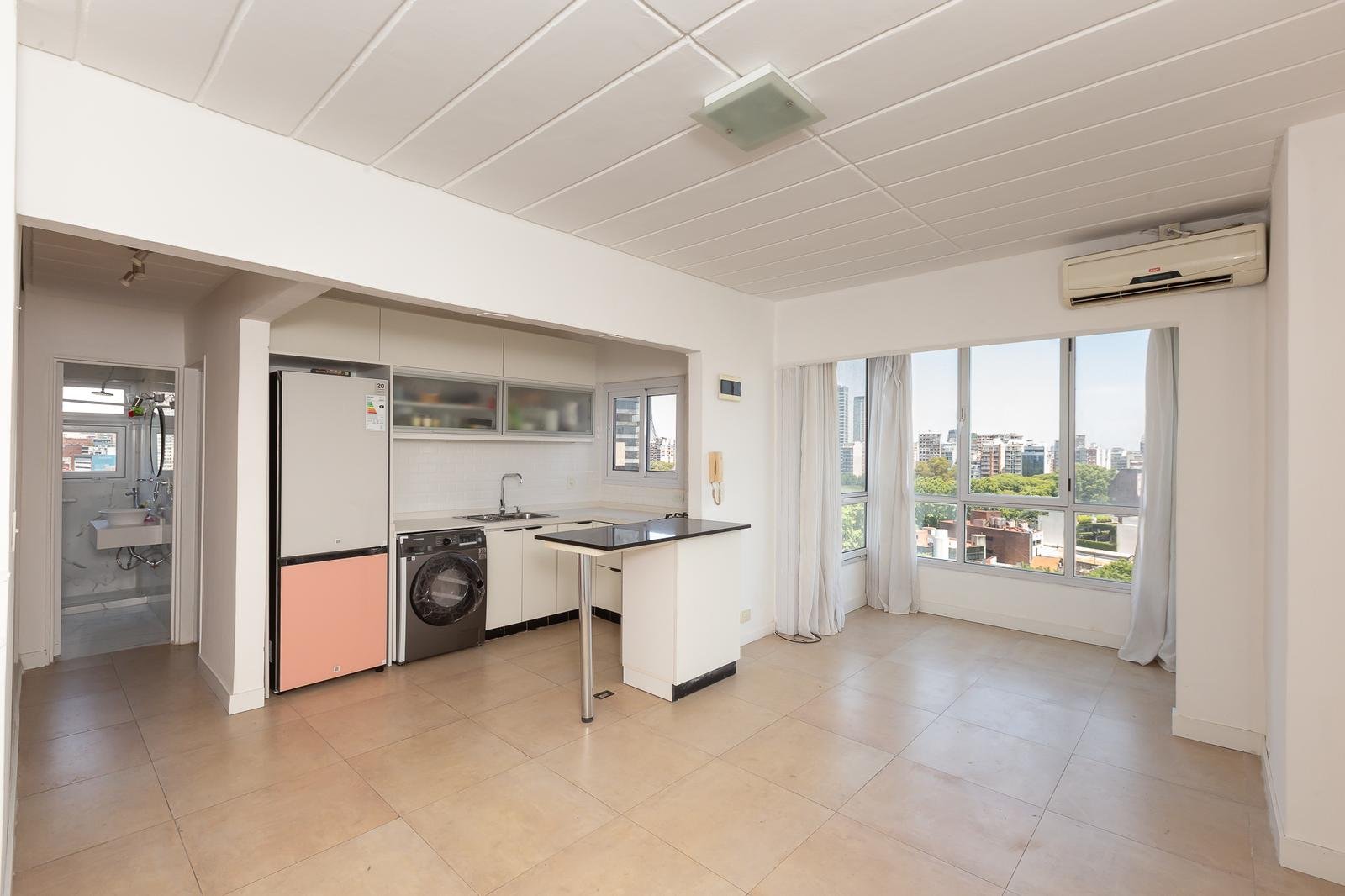 Distribución: Ingreso al living comedor con cocina integrada y el balcón incorporado, generando un ambiente más amplio. Dormitorio con buen espacio de guardado. Baño completo con ducha.